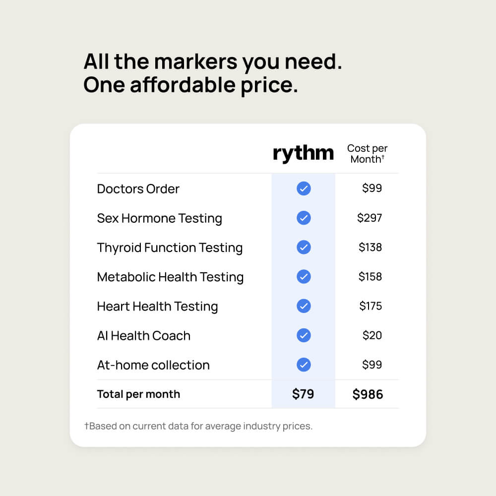 Most blood testing companies charge $500 or more for a single test per biomarker, providing only a one-time snapshot that doesn’t capture your long-term health trends or reflect your true baseline. This approach can lead to missed patterns or even misdiagnoses due to limited data. Rythm takes a different approach, using monthly tracking to build a detailed picture of your health over time. This allows for more accurate insights, better optimization, and a clearer understanding of how your body is evolving.